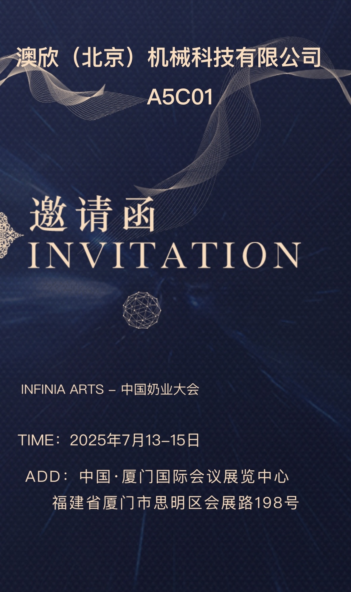 澳欣(北京)机械科技有限公司一直致力于为奶业提供先进的机械设备与技术解决方案,推动奶业的智能化、无人化、高效化发展。此次展会,我们将携众多创新产品与技术亮相,全方位展示公司在奶业机械领域的研发成果与实力,为您带来全新的行业体验。我们的展位号是A5C01,诚邀您莅临展位,与我们面对面交流,共商合作,共谋发展大计,一同探讨奶业发展新方向,携手共创奶业新辉煌 !